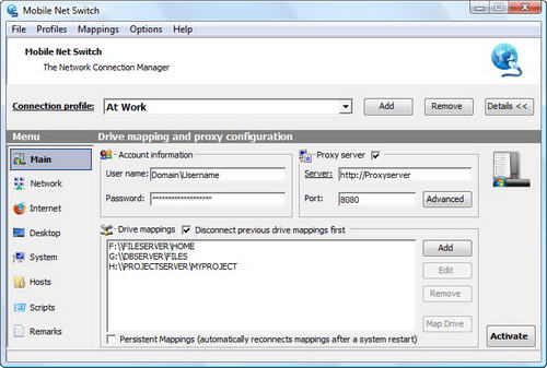 滑鼠就能把驅動器映射、印表機配置、IP設定等換成適合當前網路的配置。