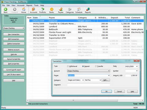 AceMoney 是一款個人理財軟體,您可以利用它來製作您個人的日記帳,例如: